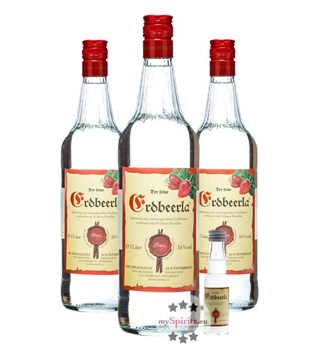Das exklusive 3er Paket Erdbeerla von Prinz beinhaltet drei 1,0 Liter Flaschen Prinz Erdbeerla, sowie eine gratis 0,02 Liter Miniatur. Der „Erdbeerla“ wird mit handgepflückten Erdbeeren der Bodenseeregion hergestellt. Durch diese wird der fruchtig-frische Geschmack von Erdbeerla gewährleistet. Das im Feinbrandverfahren gewonnene Destillat für den feinen Erdbeerschnaps lagert gute zwei Jahre im Steingut.