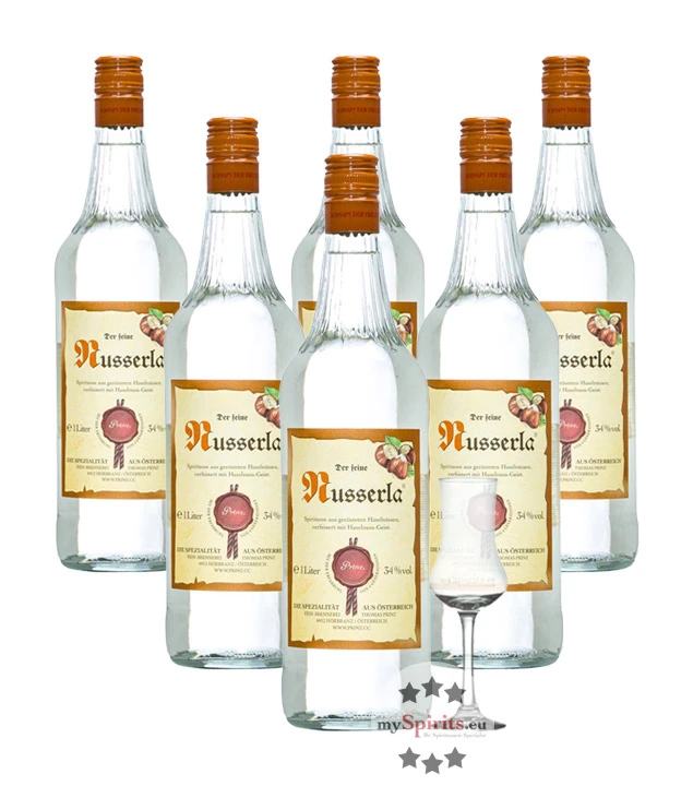 Das sechs Flaschen-Paket enthält nicht nur sechs 1,0 Liter Flaschen sondern zusätzlich einen gratis Schnapskelch mit mySpirits-Druck, der optimal für den Trinkgenuss geeignet ist. Prinz Nusserla ist eine milde Haselnuss-Spezialität die einen sortentypischen Geschmack nach Haselnüssen aufweist. Diesen Geschmack erhält Nusserla vor allem durch die lange Zeit, die das zugrunde liegende Destillat im Steingut lagert.