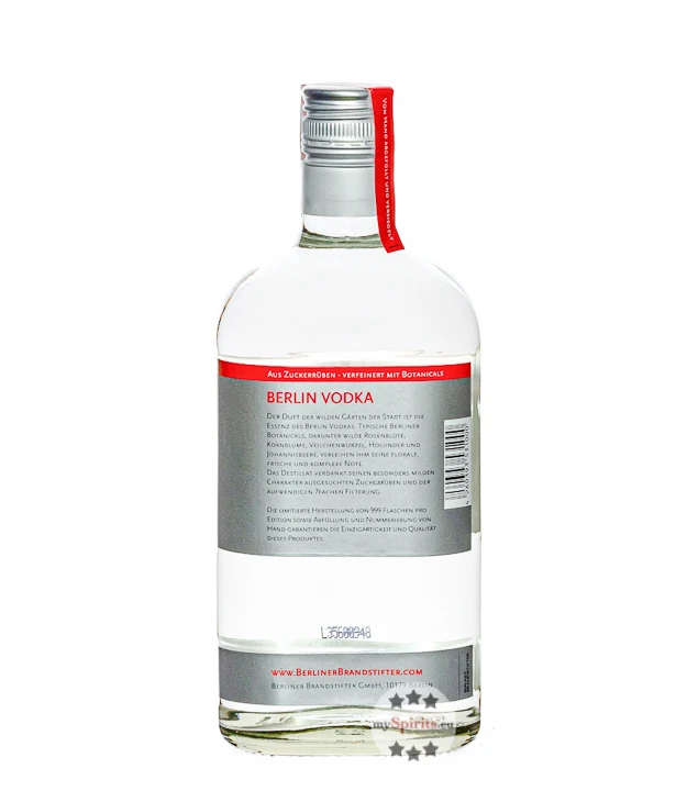 Aus dem Hause des Hauptstadt-Gins kommt nun ein Produkt, das das Zeug zum echten Helden des berüchtigten Berliner Nachtlebens hat: ein siebenfach gefilterter Berlin Vodka, der pro Edition sorgfältig per Hand in 999 nummerierte Flaschen abgefüllt wird. Aus qualitätvollen Zuckerrüben aus Frankreich entsteht die Alkoholbasis, die anschließend mit Destillaten von regionalen Botanicals und Blüten verfeinert wird. So kommt das originale Berliner Flair in jede einzelne Flasche. Holunder, Wildrose, schwarze Johannisbeere, Veilchenwurzel und Kornblumen erinnern an die sonnigen Stadtgärten mit ihrer bunten Flora und schenken dem dank des speziellen Filtrationsverfahrens milden Vodka seine charakteristischen Noten.