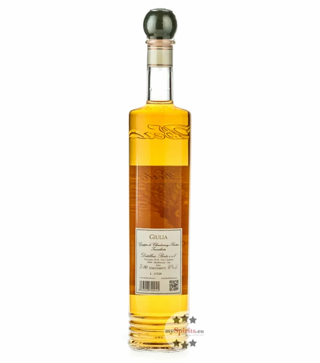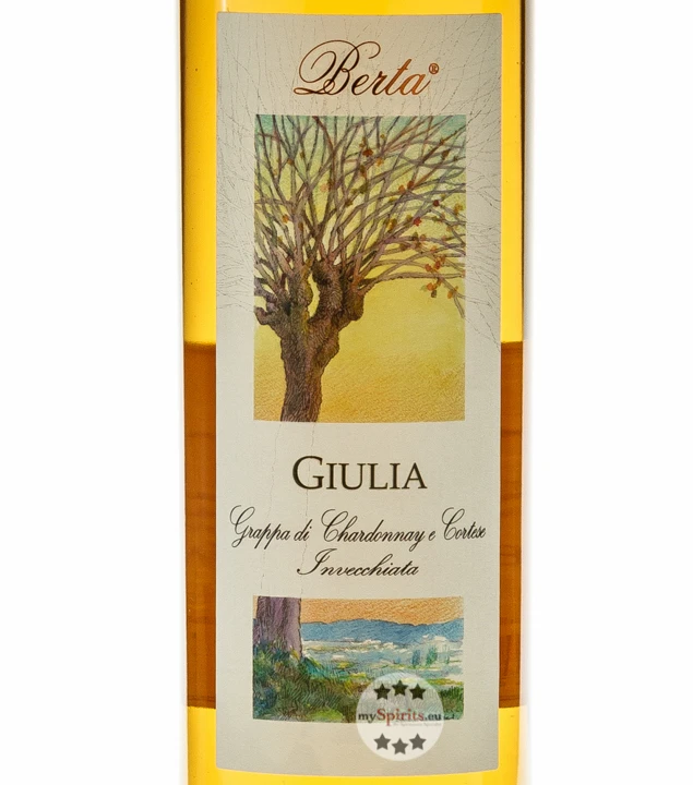 Pressfrisch wird der Trester diskontinuierlich in Dampf-Brennkolben destilliert, Zeit und Aufwand ordnen sich bei Berta der Qualität unter. Die große Erfahrung zeigt sich auch im Reifekeller, wo für jede Sorte ein geeignetes Gefäß bereit steht. Für den Grappa Giulia aus Chardonnay und Cortese hat Berta Eichenfässer aus Slavonien gewählt, von denen der Grappa auch seine golden leuchtende Farbe erhalten hat.