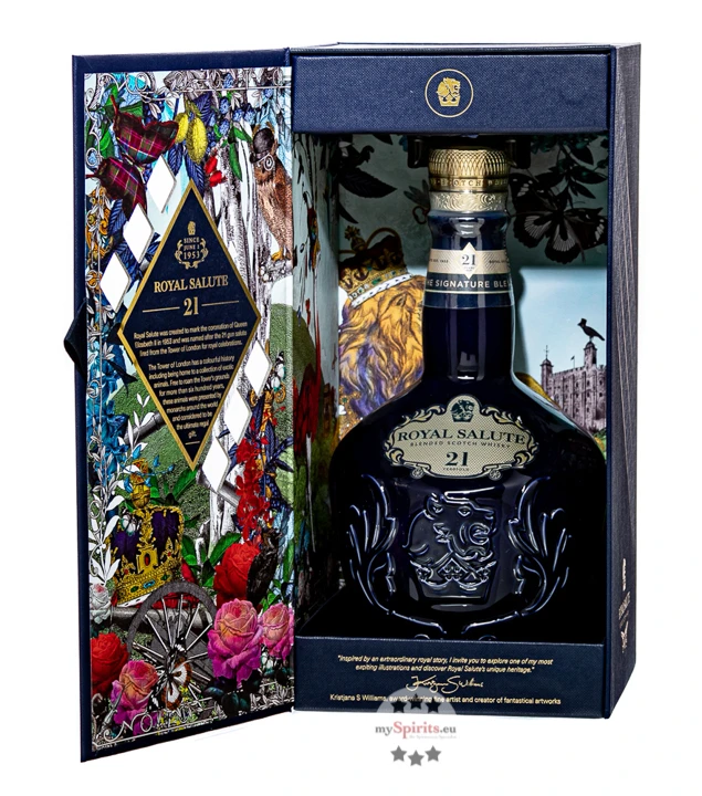 Zur Krönung von Elisabeth II zur Königin von England im Jahre 1953 haben sich die Chivas Brothers eine Besonderheit ausgedacht, die bis heute fasziniert. Der Whisky Blend Royal Salute 21 bezieht sich namentlich auf die 21 Salutschüsse, die stets abgefeuert werden, wenn ein neuer König oder eben eine Königin gekrönt werden. Alle Whiskys, aus denen Royal Salute 21 zusammengesetzt wird, stammen aus über 21-jähriger Fasslagerung, was diesen Whisky zu einem wahrhaft außergewöhnlichen Blended Whisky macht.