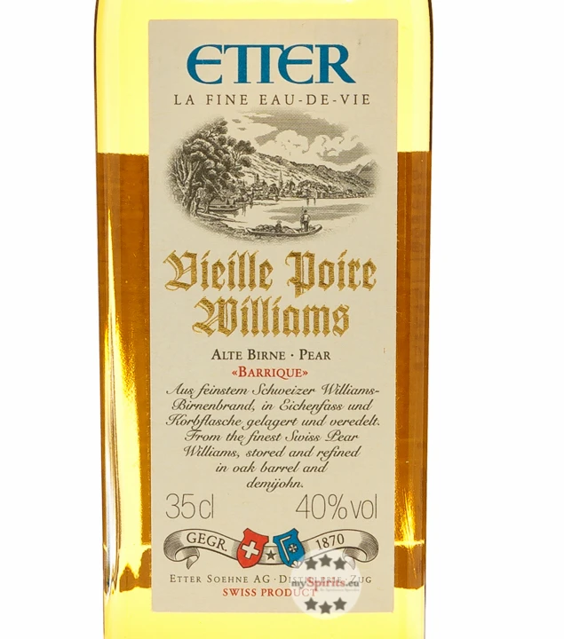 Schon seit der Gründung 1870 setzt Etter auf höchste Qualität. So werden für den Williams Vieille Poire – Alte Birne nur saftig-gereifte Williamsbirnen aus dem Wallis verwendet. Der Mittellauf des Williamsbirnen-Destillates wird schließlich zum Herzstück des Brandes. Dieses wird zunächst in Korbflaschen gefüllt und nach einem Jahr Reifezeit in aus französischer Eiche gefertigten Barriques gelagert und so geschmacklich veredelt. Vieille Poire Williams wurde schon zweimal mit der DistiSuisse Goldauszeichnung prämiert.