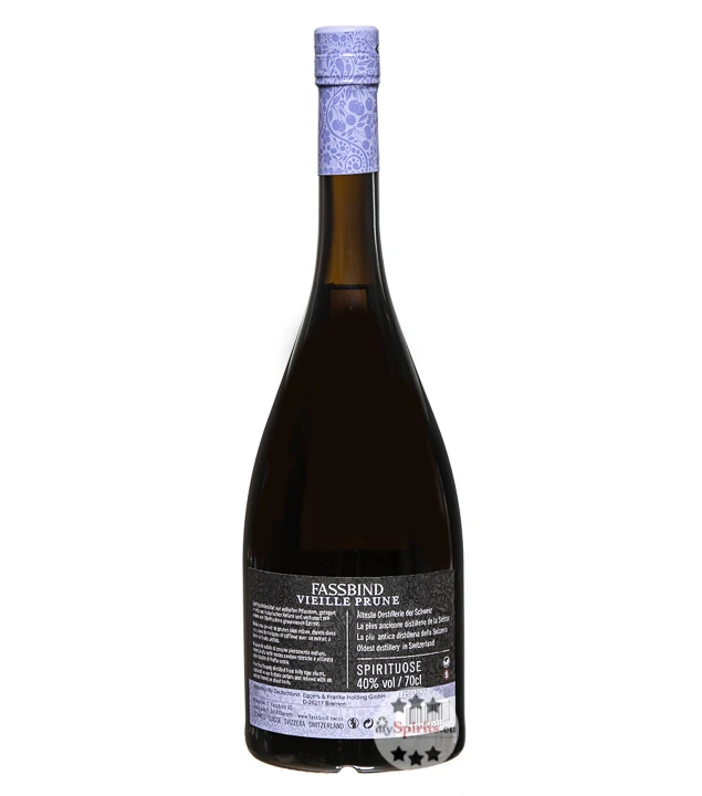 Die im Eichenholzfass gelagerten Brände verfeinert Fassbind durch einen hausgemachten Bonificateur. Er verleiht dem Pflümli die besonders fruchtig-milde Süße, die Vieille Prune so unverwechselbar und beliebt macht. Die Reifung im Holzfass bewirkt auch die charakteristische Barrique-Färbung und die typischen Mandel- und Holztöne von Vieille Prune.