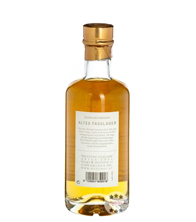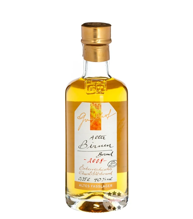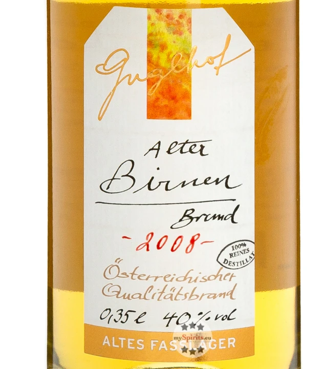 Guglhof Alter Birnenbrand wird aus Salzburger Birnen und seltenen Landbirnen hergestellt. Nach der Destillation reift dieser Brand für 8 Jahre in Eichenfässern. Dieser Obstbrand besitzt eine wunderbare Frucht und ist gleichzeitig äußerst komplex mit Andeutungen exotischer Früchte. Am Gaumen ist dieser Brand ausgesprochen spritzig und bewahrt dennoch eine ausgewogene Balance. Das Finish von Guglhof Alter Birnenbrand ist harmonisch und finessenreich.