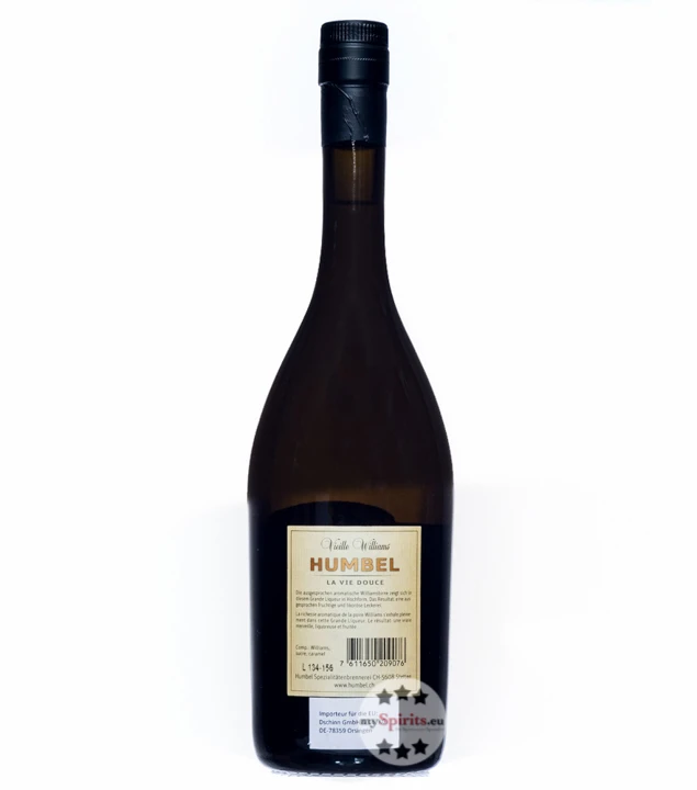 Tatsächlich hat der Humbel Vieille Williams Liqueur weniger mit Likören gemein als mit sonstigen Obstschnäpsen der üblichen Sorten Alte Birne, Alter Williams-Christ oder Vieille Poire. Nur eine ganz dezente Süßung und Abrundung durch Zucker macht den Humbel Williams Likör ‚douce‘ – also süß – trotz 40 % Alkohol. Brennmeister Lorenz Humbel sorgt persönlich dafür, dass die Aromen der feinen und reifen Williams Christ Birnen aus der Schweiz voll zur Geltung kommen.