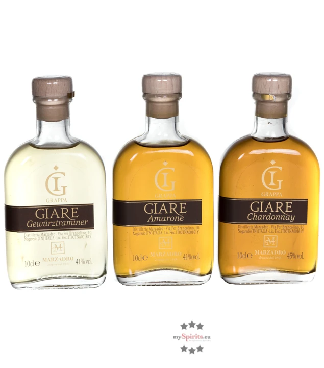 Ideal zum Probieren der Giare-Reihe von Marzadro ist dieses Grappa Geschenkset geeignet. Es beinhaltet alle drei beliebten Giare-Grappas in je 0,1 Liter-Flaschen, die die perfekte Menge für eine kleine Degustation bei Ihnen oder dem Beschenkten zuhause bieten.