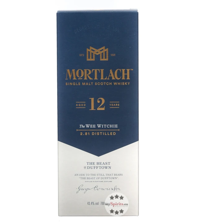 Nach einer Reifezeit von 12 Jahren erreicht Mortlach The Wee Witchie einen würzigen und einzigartigen Charakter, der Süße und Schärfe perfekt in Verbindung bringt und sich dabei ausgewogen am Gaumen präsentiert. Akzente von braunem Rohrzucker, dunkler Schokolade, Kirschkonfitüre und leichtem Tabak leiten den Geschmack und geben ihm seinen Mortlach-typischen Charakter. Mortlach Whiskys sind von ihrem einzigartigen Geschmack geprägt, der auch der innovativen und geheimen 2,81-fachen Destillierung zu verdanken ist. Bereits 1896 wurden die Brennblasen von vier auf sechs erhöht, bei denen die beiden neuen Brennblasen größer als die alten waren.