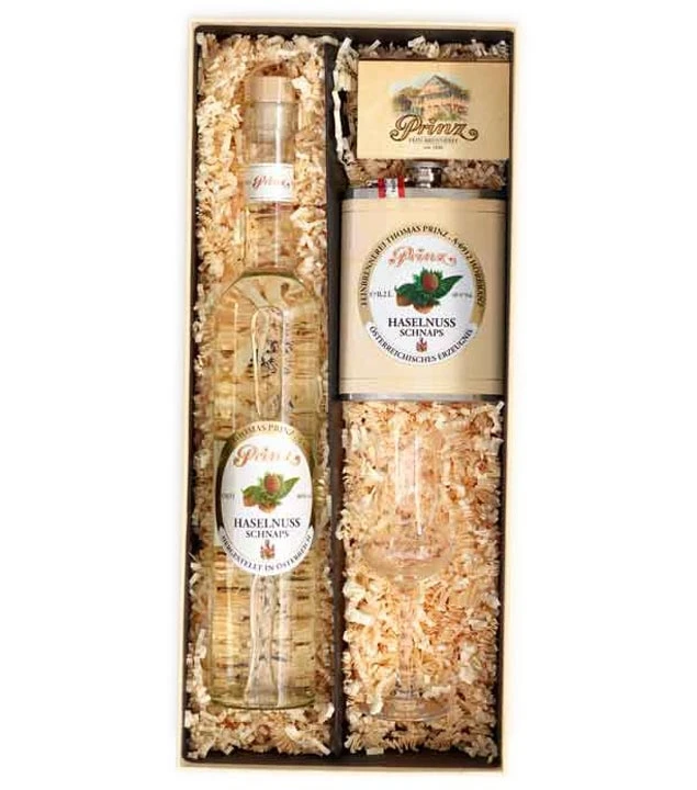 Schenken Sie das hochwertige Geschenk-Set Haselnuss mit Flachmann mit Haselnuss Schnaps der Feinbrennerei Prinz aus Hörbranz am Bodensee. Eine 0,5 Liter-Flasche und ein 0,2 Liter Edelstahl-Flachmann Prinz Haselnuss Schnaps gehören zu diesem wunderbaren Geschenk-Set, das in einer edlen Geschenkbox verpackt wird. Entdecken Sie den Haselnuss Schnaps der Feinbrennerei Prinz im Doppelpack im Geschenkpaket.