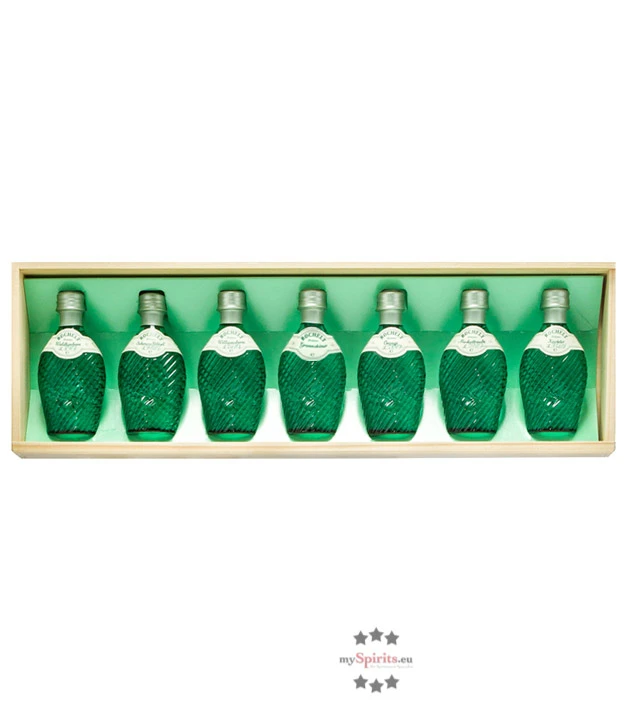 Edelbrände von Rochelt sind hohe Qualität zum zugegebenermaßen auch nicht geringen Preis. Wer sich gerne erst einmal durch die verschiedenen Obstbrände probieren möchte, bevor er sich eine große Flasche der luxuriösen Schnäpse zulegt, ist mit diesem Set bestehend aus 7 Rochelt Schnaps Miniaturen zu je 0,04l genau richtig. Die sieben kleinen Flaschen sind den großen Flaschen detailgetreu nachempfunden in ihrer smaragdgrünen Flasche und befinden sich im typischen Rochelt-Holzkistchen.