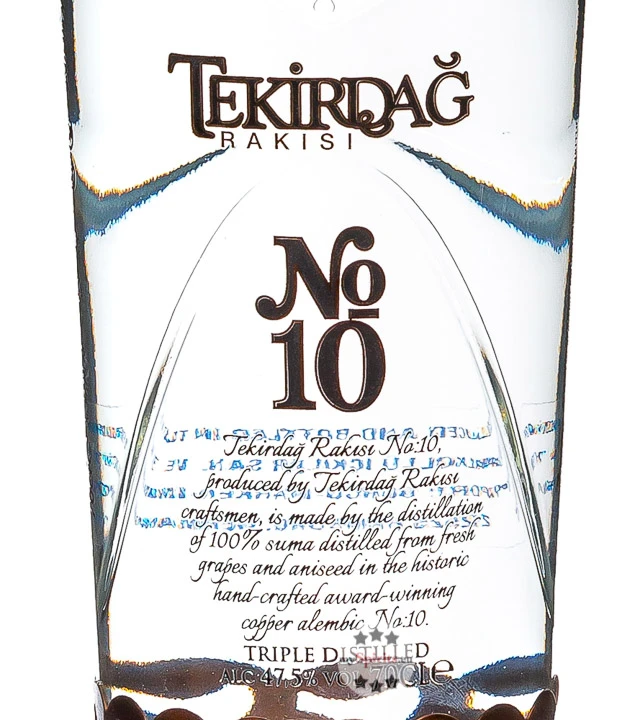 Tekirdağ Rakısı No 10 erhält seinen Namen von dem historischen, in Handarbeit gefertigten Kupferdestilliergefäß No. 10. Dieses wurde von talentierten Kupferschmieden aus Frankreich gefertigt und zunächst in die Diyarbakir Rakı Destillerie gebracht. Unter fachkundigen Rakı-Freunden erhielt es bald einen legendären Status, denn in diesem Destilliergefäß hergestellter Raki wurde mehrfach international ausgezeichnet. Nachdem es in die Tekirdag Fabrik verlegt wurde, gewann es schnell das Herz der Tekirdağ-Destilliermeister. Rakı No 10 wird ausschließlich in diesem Destilliergefäß hergestellt.