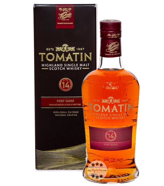Die schottische Brennerei Tomatin zählt zu den 10 größten ihres Landes und wird von Whiskyliebhaberinnen und Liebhabern heute mehr denn je mit Hochachtung gegenüber ihren Malts gerühmt. Die Tomatin 14 Jahre Abfüllung ist ein intensiv beeriger Vertreter. Zurückzuführen ist dies auf das Portwein-Cask-Finish: Nach der Reifung im Bourbon Barrel erfährt der Whisky ein etwa zwölf Monate andauerndes Finish in Tawny Port Pipes, die über 50 Jahre lang Portwein enthielten.