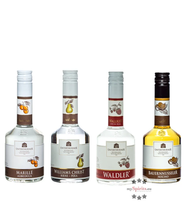 Jeweils eine kleine Flasche mit 200ml Inhalt des Unterthurner Waldler Original, des feinen Walnusslikörs Bauernnusseler Nocino, des Williams-Christ-Birnenbrands und der Marillenspirituose Albicocca. Ideal zum Probieren oder Verschenken im Set – entdecken Sie Ihren Liebling!